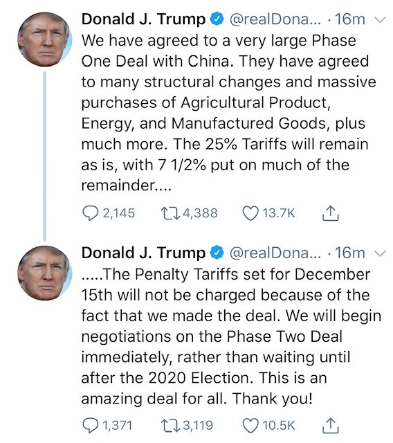 Phase I Agreement with China in Progress - Planned December 15th Tariff Increase to be Withdrawn
